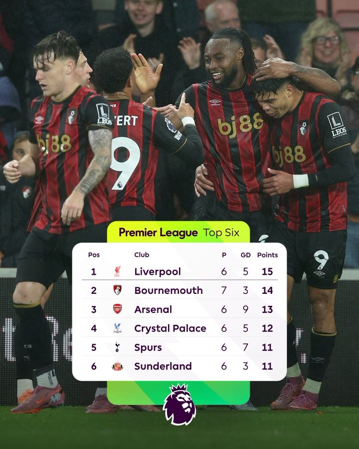 连续六轮不败升至积分榜第二,伯恩茅斯创队史英超赛季最佳开局